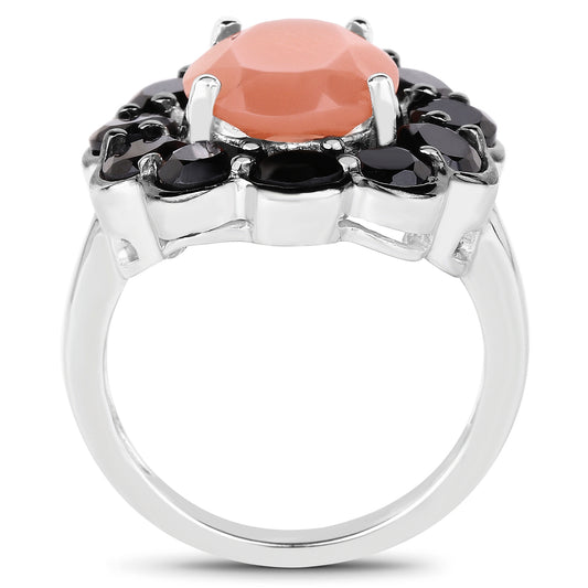 Genuine Peach Moonstone and Black Spinel Sterling Silver Halo Ring