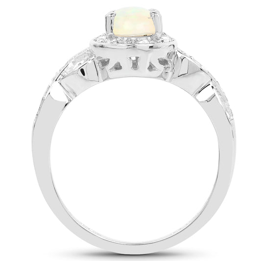 Genuine Ethiopian Opal and White Topaz Ring Sterling Silver Halo Ring