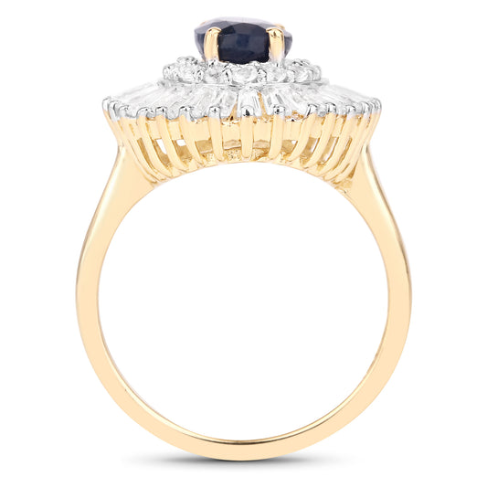 Genuine 14K Yellow Gold Plated Plated Sapphire and White Topaz Sunburst Ring Sterling Silver