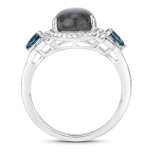 Genuine Labradorite, London Blue Topaz and White Topaz Sterling Silver Ring