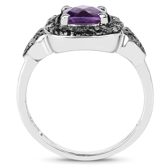 Genuine Amethyst and Black Diamond Sterling Silver Halo Ring