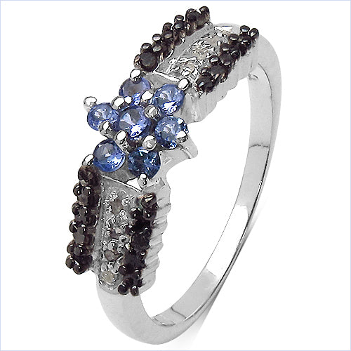 Genuine Tanzanite, Black Diamond and White Diamond Sterling Silver Floral Ring