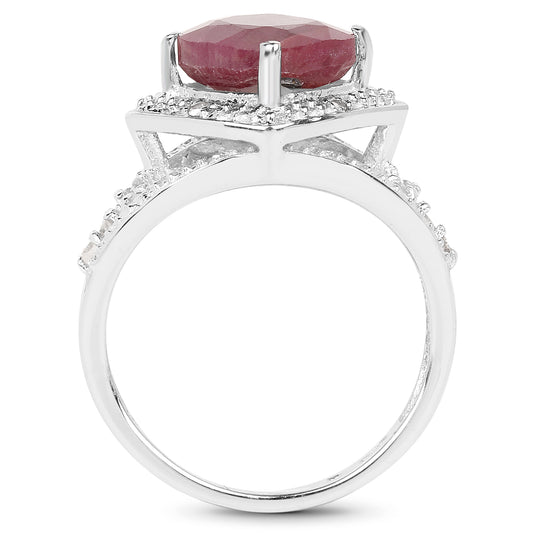 Genuine Ruby and White Diamond Halo Ring in Sterling Silver
