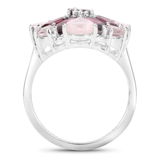 Genuine Rhodolite Garnet and Rose Quartz Sterling Silver Floral Ring