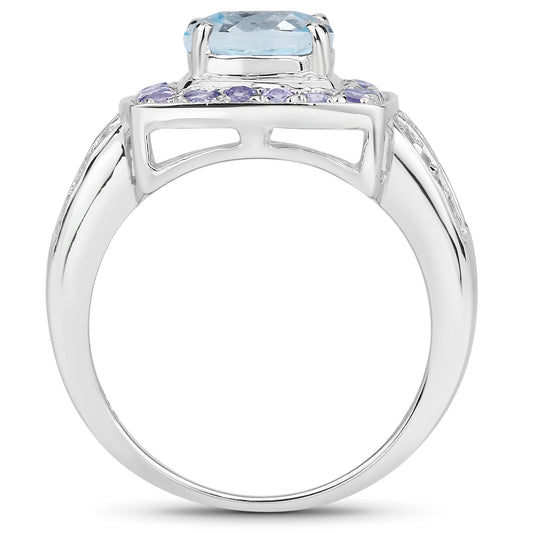 Genuine Blue Topaz, Tanzanite and White Topaz Sterling Silver Halo Ring