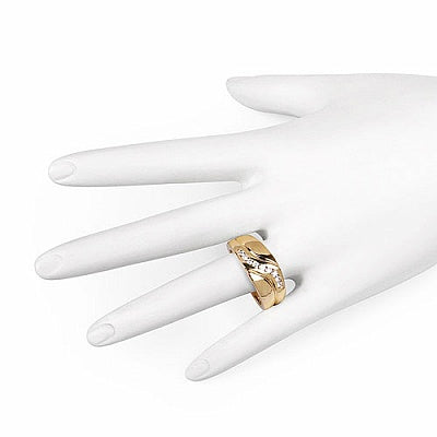 Made from high-quality .925 sterling silver and adorned with gold plating, this ring showcases 0.70CTW of genuine white cubic zircon stones in a modern, sleek design. The curved line of sparkling stones adds a touch of elegance and flair to the polished band, making it an ideal piece for the man who values timeless sophistication with a contemporary edge.