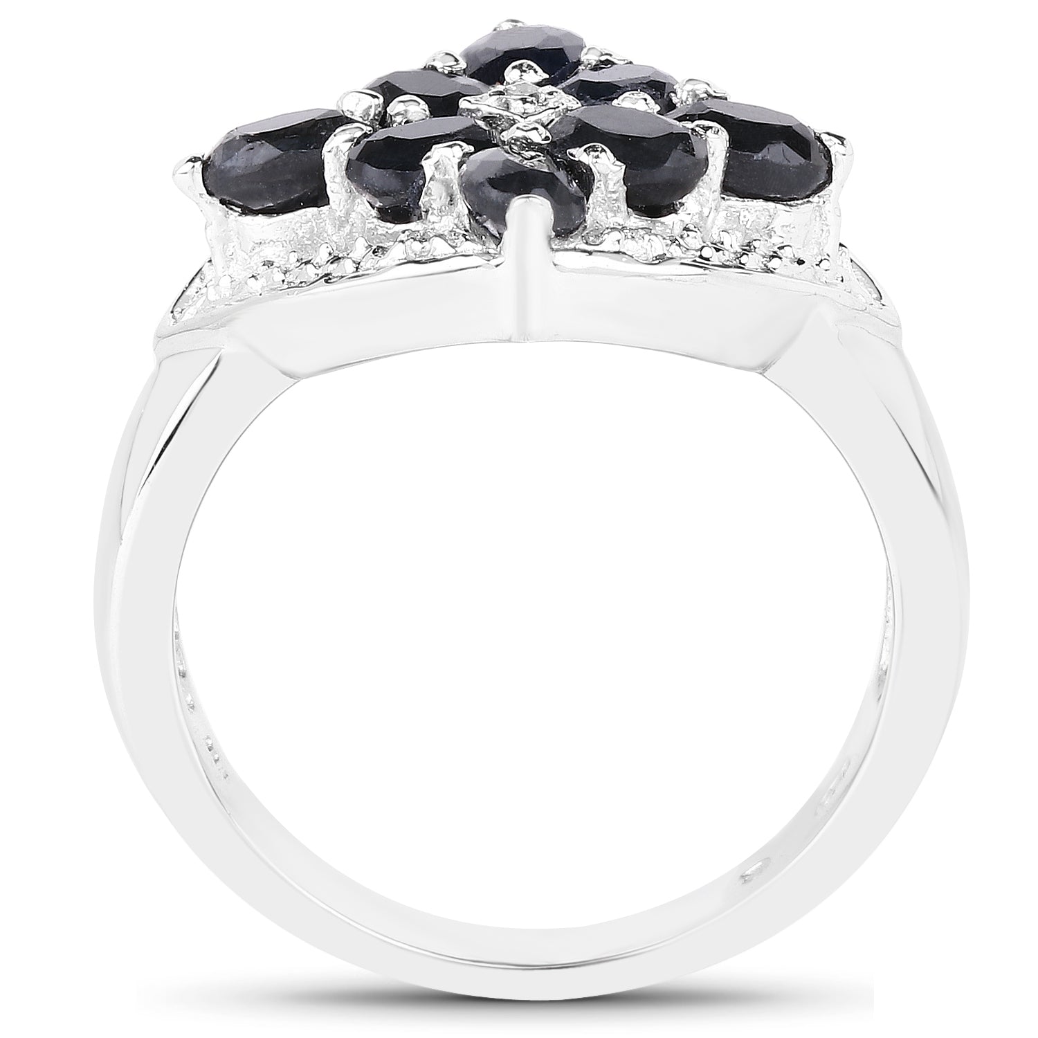 This 1.76 carat Genuine Black Sapphire and White Diamond Cluster Ring in Sterling Silver is a true statement piece. The intense black sapphires are set in a beautiful floral design, accented with sparkling white diamonds that add a touch of brilliance. The sterling silver band enhances the dramatic contrast between the stones, making this ring a perfect choice for anyone looking to add a touch of elegance and mystery to their jewelry collection. Whether worn on special occasions or as an everyday signature piece, this ring is sure to impress.