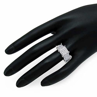 Turn heads with the BridalMe 1.14CTW White Cubic Zirconia Ring. Crafted from gleaming .925 sterling silver, this ring features a bold, geometric design with three sections of pavé-set cubic zirconia stones. The intricate detailing and dazzling sparkle make this ring the perfect accessory for adding a touch of glamour to any outfit.