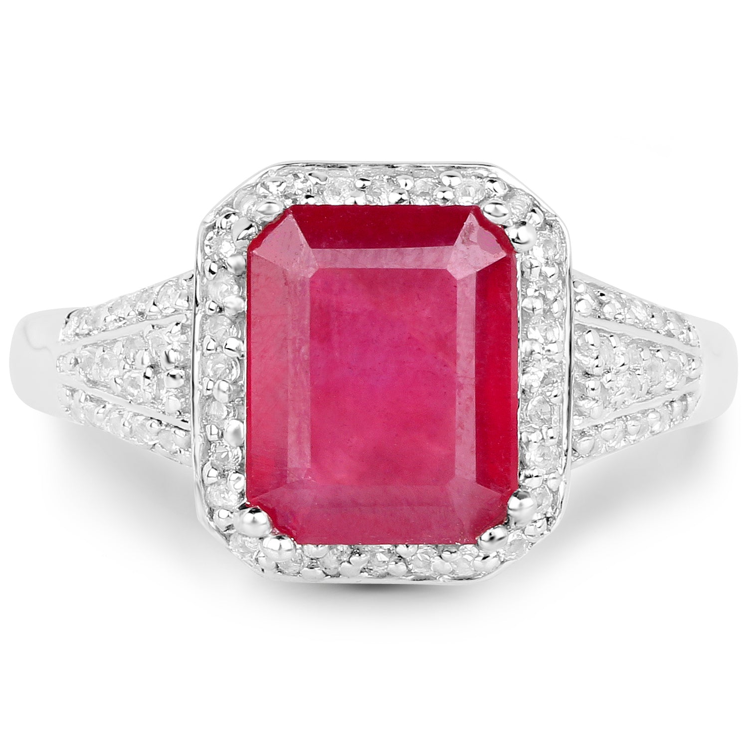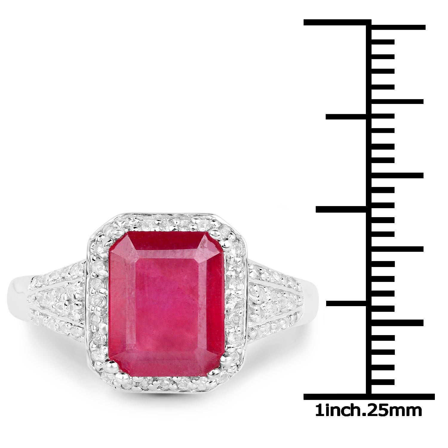 Add a touch of luxury to your jewelry collection with this 4.55-carat glass-filled ruby ring set in sterling silver. The vibrant ruby is surrounded by a halo of dazzling white topaz stones, creating a striking contrast that exudes elegance. The detailed band, adorned with additional topaz accents, completes the look, making this ring an ideal accessory for special occasions or everyday glamour.